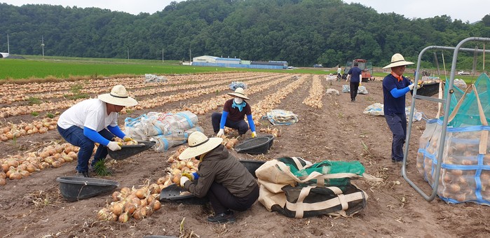 이날 일손 돕기에 참여한 산림조합 직원들은 더운 날씨에도 불구하고 양파 수확 돕기로 구슬땀을 흘렸다.