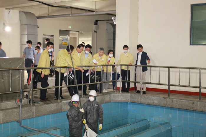 최근 전국적으로 확산되고 있는 수돗물 유충 사태에 따라 그 근원지로 알려진 정수장 내 입상 활성탄 등 여과지에 대한 실제 확인‧점검이 필요하다는 시의원들의 지적에 따라 미래통합당 소속 부산시의회(원내대표 김진홍 의원) 의원 4명과 이근희 본부장을 비롯한 부산상수도사업본부 관계자들은 지난 27일(월) 오후 서부산권 수돗물을 담당하고 있는 덕산정수장에 대한 현장 점검을 실시했다.