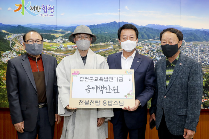 합천군 가회면 천불천탑 용탑스님이 20일 (사)합천군교육발전위원회(이사장 문준희)를 방문하여 향토인재육성에 써달라며 교육발전기금 2백만원을 전달했다.