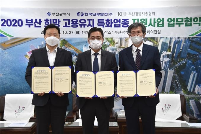 부산시(시장 권한대행 변성완)는 한국남부발전(사장 신정식)과 지난 27일 오후 2시 시청 7층 국제의전실에서 코로나19로 인해 어려움을 겪고 있는 지역기업을 지원하기 위한 「2020 부산 희망 고용유지 특화업종 지원사업 업무협약」을 체결했다고 밝혔다.
