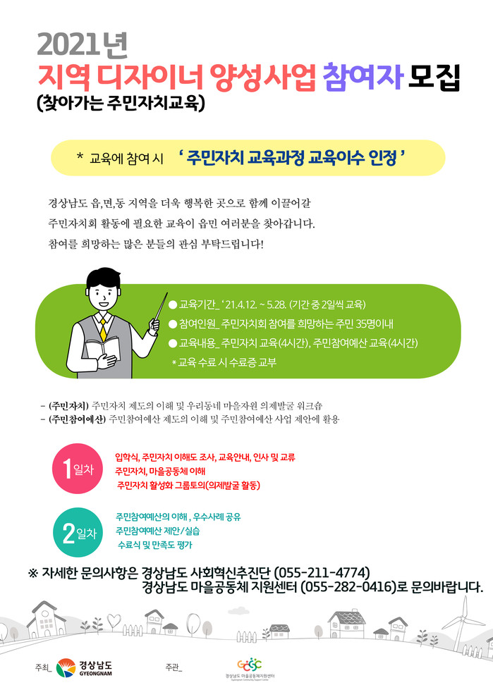 [창원=최성일 기자] 경남도는 12일 창녕군을 시작으로 오는 5월까지 주민자치위원회를 주민자치회로 전환할 예정인 7개 시·군 12개 읍·면·동에서 ‘지역디자이너 양성사업’을 추진한다고 밝혔다.