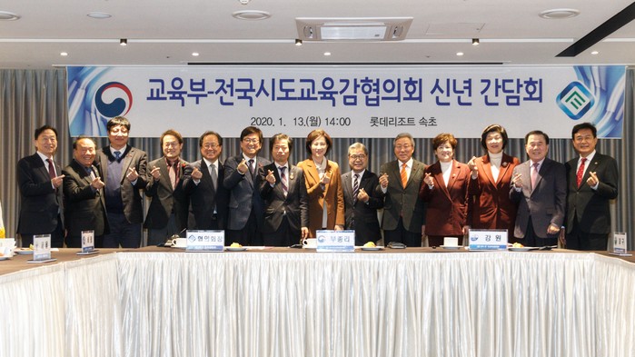 김석준 부산광역시교육감이 13일 오후 3시 강원도 속초시 롯데리조트에서 열린 전국시도교육감협의회 총회에서 다른 시도교육감들과 총회 안건에 대해 협의하고 기념촬영을 하고 있다.