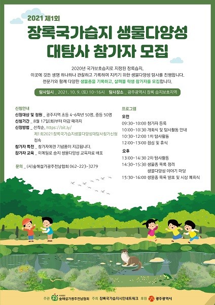 탐사는 오는 10월9일 식물·곤충·조류·어류·포유류 총 5개 분야의 전문가들이 각 팀의 참가자들과 함께 장록습지 내 서식하고 있는 생물종을 찾아 관찰한 후 생물 목록 및 생태 지도를 작성하고, 이를 다른 참가자들과 공유하고 토의하는 방식으로 진행된다.