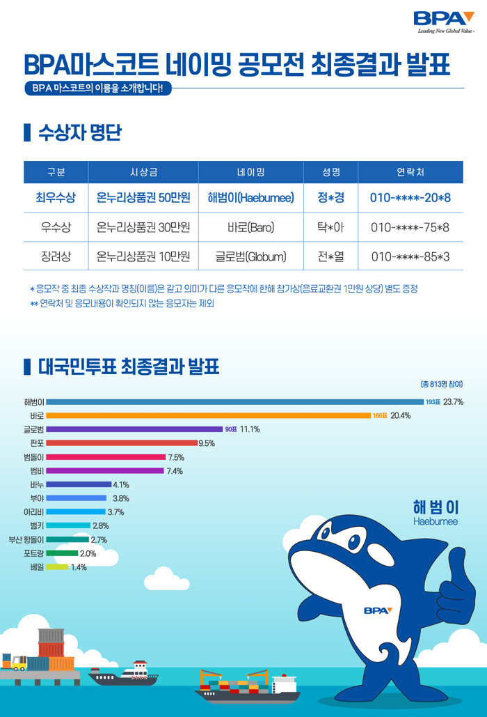 이번 공모는 3월 23일부터 4월 1일까지 BPA 마스코트에 대한 명칭과 명칭의 의미를 국민의 다양한 아이디어로 접수 받고, 그 중 자체평가를 통해 13개를 대국민 투표작으로 선정한 뒤, 4월 8일부터 4월 17일까지 10일간 대국민 투표를 진행해 BPA 마스코트의 이름을 최종 선정하는 방식으로 진행됐다.