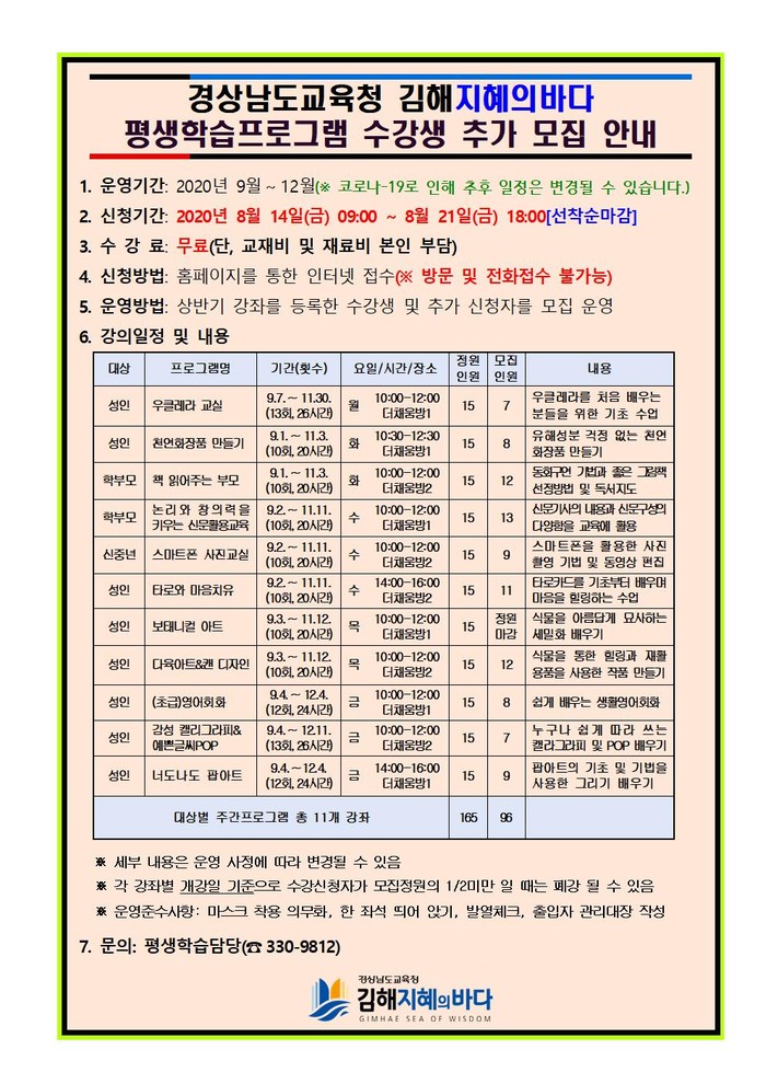 수강생모집은8월14일(금)부터이며경상남도교육청김해지혜의바다홈페이지를 통해 온라인 신청만 가능하다.