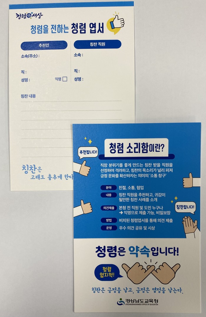 직원칭찬과 추천은 경남교육청 구성원과 도민이면 누구나 본청과 제2청사 현관에 비치된 청렴소리함과 청렴 엽서 보내기를 통해 참여할 수 있다. 교육지원청은 별도 설치된 여러 소통 창구를 통해 지역별로 특색있게 칭찬, 청렴 문화 조성 활동을 하고 있다.