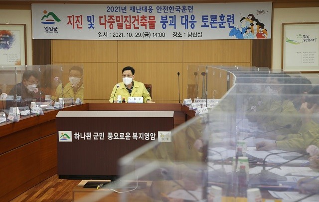 올해는 코로나19 발생에 대응할 수 있는 방역 의료체계가 더욱 강화됐고 영암군의 인구대비 백신접종 완료율이 80%를 넘어 집단면역 형성도 순조롭게 진행 중이라고 판단됨에 따라 밀집도 완화를 위해 현장훈련을 실시하지 않는 대신, ‘지진 및 다중밀집건축물붕괴’ 발생을 가정해 10개 유관기관‧단체와 합동 토론훈련을 가졌다.
