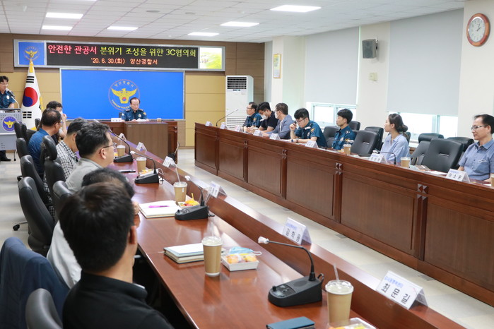 양산경찰서(서장 이병진)는, 지난 30일 시청민원실, 사회복지과, 행정복지센터 등 대민접점 부서 공무원 약 20명이 참석한 가운데, 관공서 내에서 발생하는 특이민원에 대응하기 위한 협력 방안이라는 주제로 지역공동체치안협의체를 개최하였다.