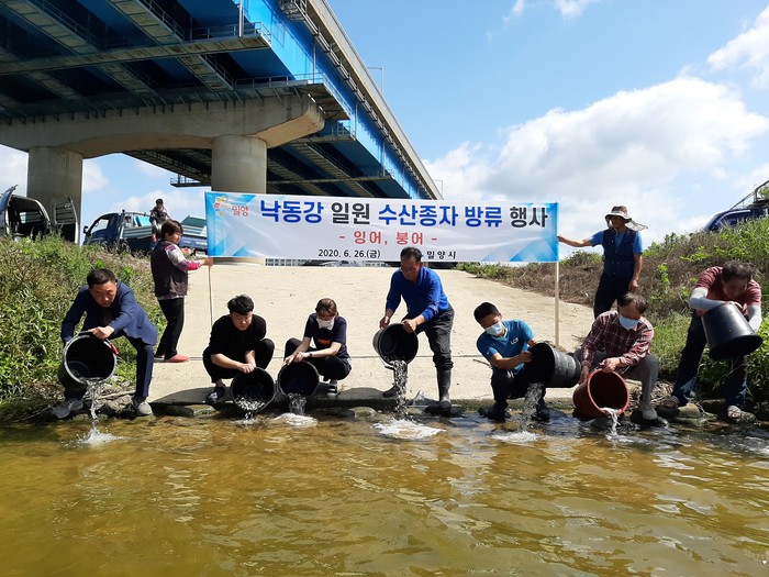 밀양 시는 지난 26일 시관계자, 밀양시 관내 내수면어업 허가자 등 10여명이 참가한 가운데 하남읍 수산리 낙동강 일원에서 잉어·붕어 어린고기 10만여 마리를 방류했다.