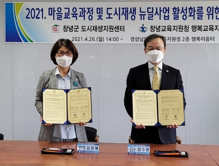 창녕군(군수 한정우)은 지난 26일 창녕교육지원청 행복이음터에서 창녕군 도시재생지원센터(센터장 성수용)와 창녕행복교육지원센터(센터장 김정애)간 ‘도시재생 및 마을교육 활성화를 위한 업무협약’을 체결했다고 밝혔다.