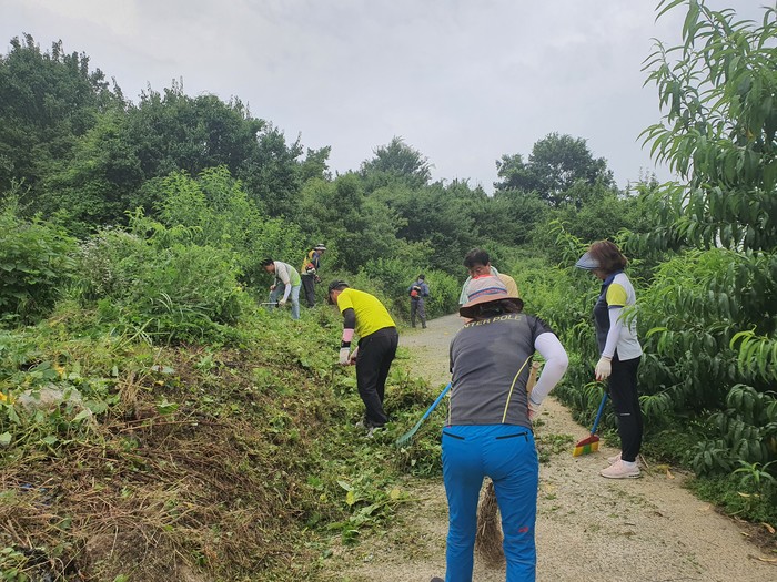 진주시 상봉동 주민자치위원회(위원장 김기식)는 지난 11일 대룡골 복숭아꽃 둘레길 가꾸기 사업의 일환으로 대룡골 둘레길 환경정비를 실시하였다. 이날 무더운 날씨에도 불구하고 주민자치위원 10여 명이 참여하여 복숭아나무 가지치기 작업과 주변 풀베기 등 환경 정비에 구슬땀을 흘렸다.