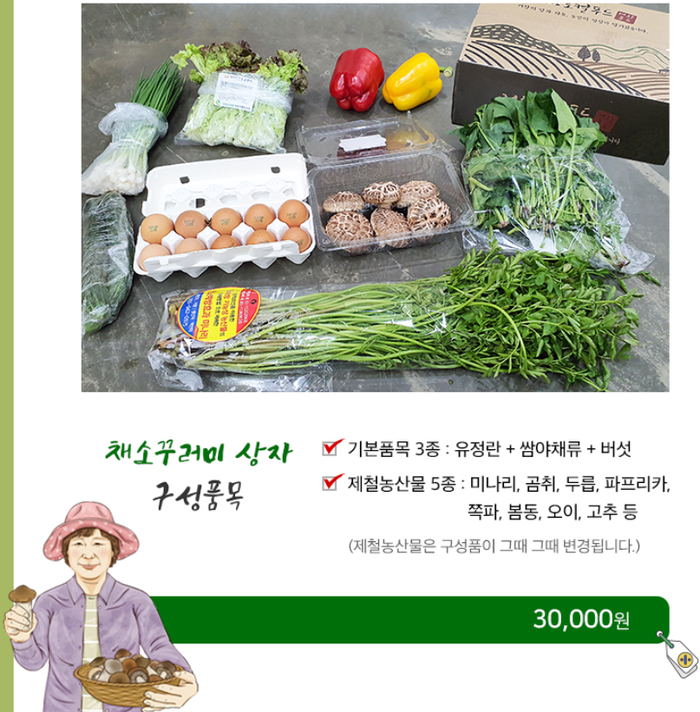 다음 채소꾸러미 구성품목은 항생제, 산란 촉진제 등을 사용하지 않고 자연 그대로 방사해 키운 건강한 닭이 낳은 유정란, 배송 당일 수확해 싱싱한 쌈채소류, 은은한 향이 일품인 버섯 그리고 제철 농산물인 미나리, 두릅, 파프리카 등으로 구성돼 있다.