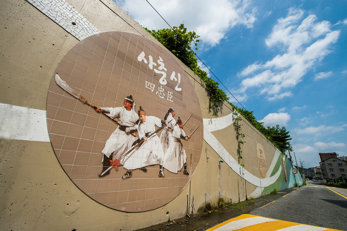 시는 3억원을 들여 동상동 분성체육공원 아래 옹벽을 임진왜란 최초 4명의 의병장인 사충신 이야기를 담은 그림타일로 장식하는 경관개선사업을 완료했다고 밝혔다.