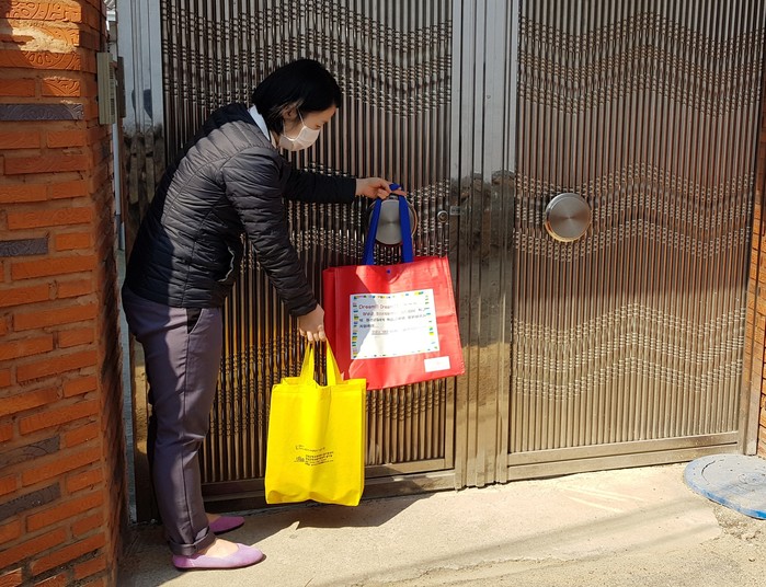 | 응원간식으로 구성된 가방을 비대면으로 전달하고 있다. |