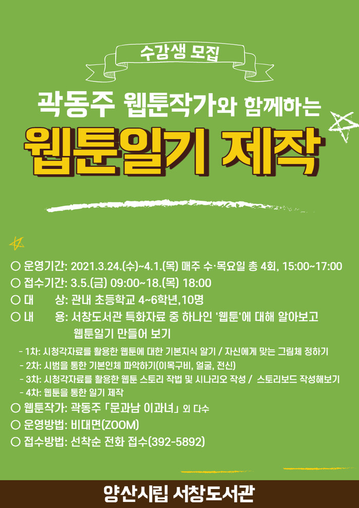 양산시립 서창도서관은 ‘곽동주 웹툰작가와 함께하는 웹툰일기 제작’ 특강을 운영한다.
