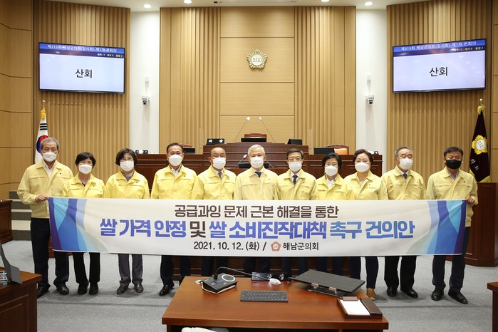 [해남=정찬남 기자] 전남 해남군의회는 지난 12일 제315회 임시회 제1차 본회의를 열고 이성옥 산업건설위원장이 대표발의 한 ‘공급과잉 문제 근본 해결을 통한 쌀 가격 안정 및 쌀 소비 진작 대책 촉구 건의안’을 채택했다.