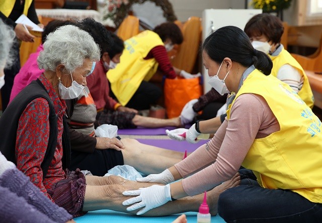 | ▲ 강진군, 지난 26일 칠량면 반계·장포마을 주민 대상 73번째 군민행복 희망나눔 사업 발 맞사지 봉사 활동 / 사진=강진군 제공 |