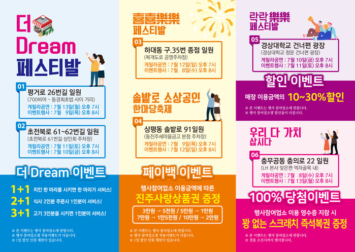 진주시는 코로나19로 침체된 골목상권 활성화를 위해 「골목 소상공인 한마당 행사」를 오는 7월 8일부터 14일까지 7일간 평거동, 가호동 등 6개 상권에서 실시한다고 밝혔다.
