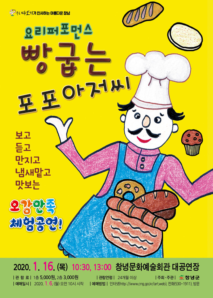 1월 16일에는 오전 10시 30분과 오후 1시에 어린이 요리 뮤지컬 ‘빵굽는 포포아저씨’가 2020년 첫 공연의 문을 연다. ‘빵굽는 포포아저씨’는 관객들이 직접 빵 반죽을 보고, 듣고, 만지고, 냄새를 맡고 끝난 뒤 맛있는 쿠키를 먹을 수 있는 오감만족 체험공연이다.