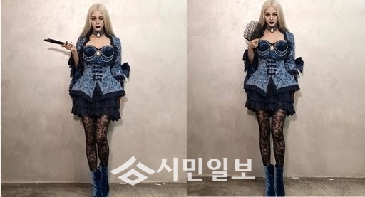 사진 속 한예슬은 블루컬러의 상하의 원피스를 입은 뱀파이어 모습으로 변신한 모습으로 감탄을 자아냈다.