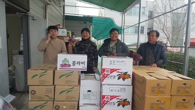| 강진산 채소 및 과일 생산 농민들이 서울 수도권 대형 마트에 납품할 상품과 함께 기념 촬영을 하고 있다. / 강진군 제공 |