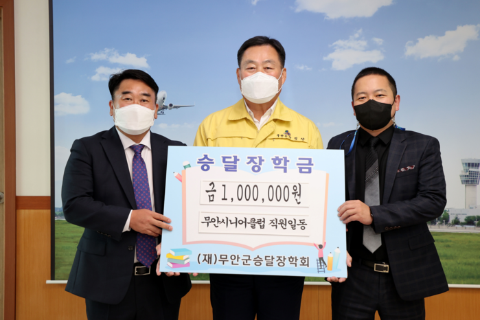 무안군(군수 김산)은 지난 21일 무안시니어클럽(관장 박진득)에서 장학금 100만원을 (재)무안군승달장학회에 기탁했다고 밝혔다.