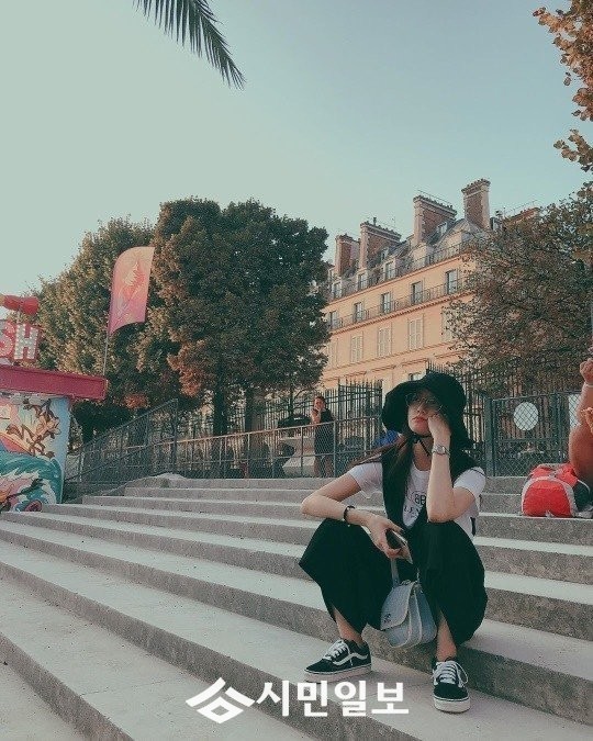 사진 속 윤아는 계단 위에 앉아 턱을 괴고 편안하게 앉아 있다.