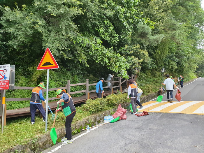 진주시 상봉동 지역자율방재단(회장 설대호)은 지난 9일 본격적인 여름철 우기에 대비하여 취약지역 피해예방을 위한 활동을 실시하였다. 이날 자율방재단과 공무원들은 관내 침수피해예상지역을 점검하며, 비봉산 산복도로의 재해위험목을 제거하고 배수로에 쌓여있는 낙엽, 토사 제거 작업에 구슬땀을 흘렸다.