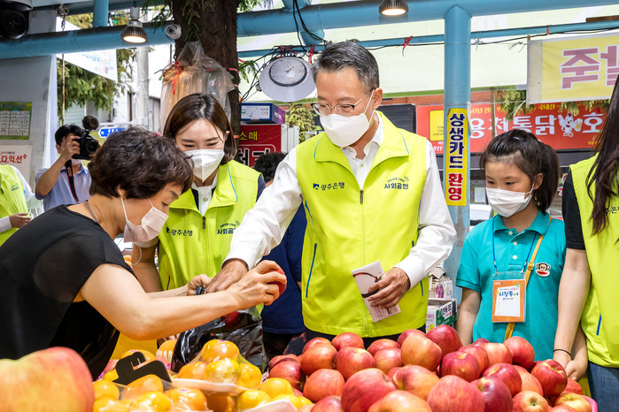 매년 명절마다 전통시장 장보기 행사를 펼쳐온 광주은행은 코로나19 장기화로 경기침체의 직격탄을 맞고 있는 지역 전통시장의 활성화를 위해 올해도 전통시장 장보기 행사를 펼쳤다.