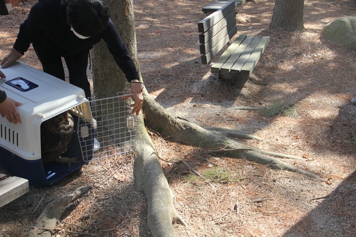 그러나 활동반경이 넓고 다른 새나 소동물을 잡아먹는 육식 조류의 맹금류인 수리부엉이를 현 사육시설 내에서 보호하기에는 어려움이 있어 경상대학교 동물의료원 경남야생동물구조센터에 자문을 구하였다.