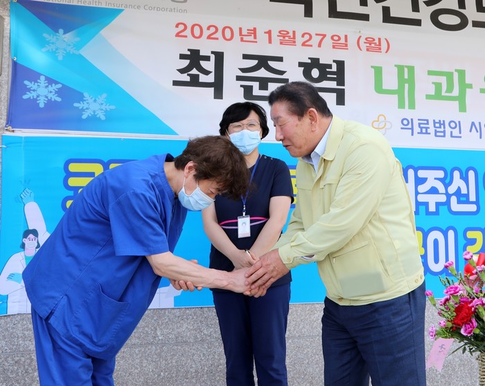 코로나19 대응 의료진 감사 캠페인의 하나로 추진된 이날 방문에서 조 군수는 박문수 병원장을 비롯한 병원 관계자에게 과일과 카네이션 꽃바구니 등 격려품을 전달하고 직원들의 노고를 격려했다.
