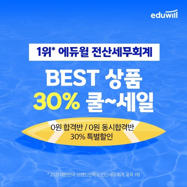 [시민일보 = 여영준 기자] 종합교육기업 에듀윌(대표 박명규) 전산세무회계는 ‘핫-썸머 쿨-세일' 이벤트를 통해 0원 합격반, 0원 동시합격반 등 수강 과정에 30% 할인 혜택을 제공하고 있다고 밝혔다.