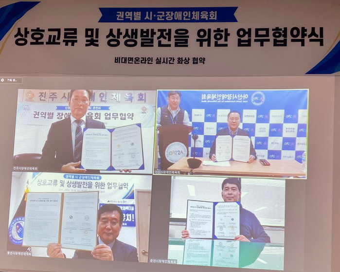 이날 협약식은 코로나19 확산 방지를 위해 각 회의실에서 비대면 온라인으로 진행됐으며 진주시 장애인체육회와 용인시·춘천시·아산시 장애인체육회가 함께 장애인 체육시설 건립과 운영에 따른 정보를 공유하고 활성화 방안을 모색했다.