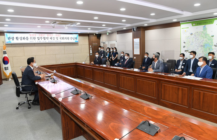 이번 협약은 포스트 코로나를 대비해 조해진 지역구 국회의원과 4개 자치단체장이 모두 참석해 지역의 자연·문화 등 관광자원을 함께 발굴·연계해 지역관광 산업을 활성화하기로 협의했다.