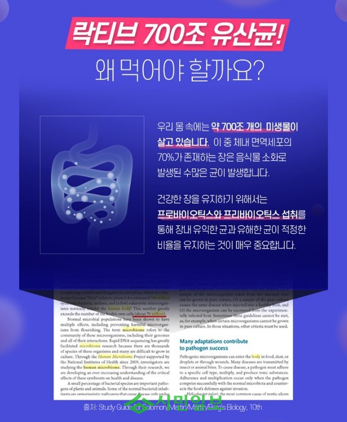 대체 왜 700조라는 수식어가 붙었나 확인해보니, 우리 몸속 에 살고있는 약 700조 개의 미생물 중 체내 면역세포의 70%가 있는, 장의 건강을 위한 프로바이오틱스-프리바이오틱스 제품이라는 설명이다.
