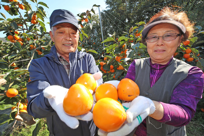 2일 산청군 시천면 우성농장에서 조형섭-박영옥 부부가 산청곶감 원료감인 고종시(떫은감)를 선보이고 있다.