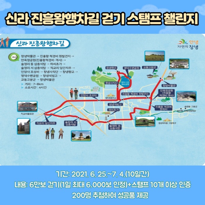 창녕군(군수 한정우)은 지역의 문화유적을 돌아보며 걷기활동을 할 수 있는 ‘신라진흥왕행차길 걷기’스탬프 챌린지를 오는 25일부터 7월 4일까지 운영한다.