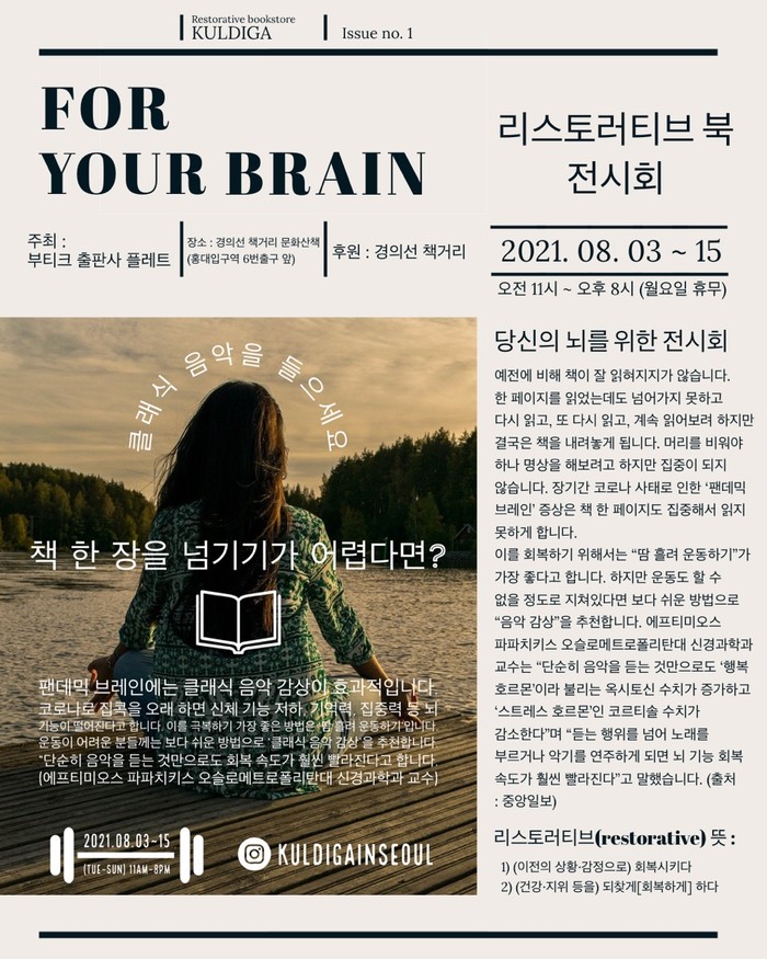 ‘리스토러티브 북 전시회’는 경의선 책거리 내 테마산책인 독립서점 ‘쿨디가(KULDIGA, 북유럽 라트비아의 소도시 이름)’를 운영하고 있는 부티크 출판사 ‘플레트(PULETTE)’에서 장기간 코로나 사태로 인해 팬데믹 브레인 증상을 겪고 있는 사람들을 위해 기획했다.