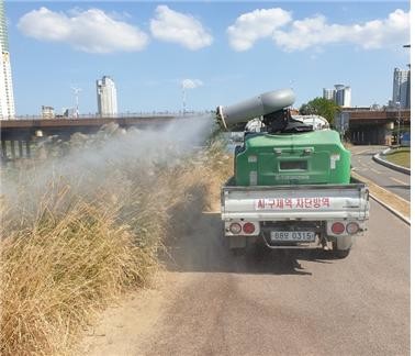 태화강 철새도래지 방역을 위해 방역차량과 드론을 이용하여 10월부터 태화강 삼호대숲과 주변 산책로 및 강 비탈면 등을 주 5회 이상 소독하고 있다.