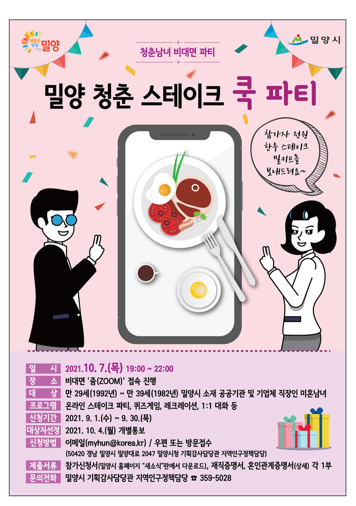 밀양시는 지역 내 미혼남녀 만남의 자리를 마련해 폭 넓은 교류 기회를 제공하고, 결혼친화적인 분위기를 조성하기 위한 ‘밀양 청춘 스테이크 쿡 파티’ 참가자를 공개 모집한다.
