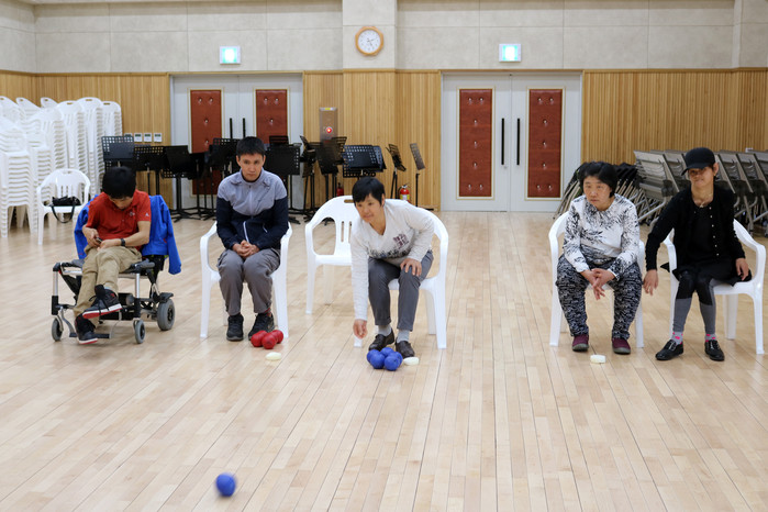 ‘보치아’는 뇌성마비 중증장애인들이 참여하는 스포츠다. 적색과 청색의 공을 던지거나 굴려 표적구에 가까운 공의 숫자로 점수를 매긴다.