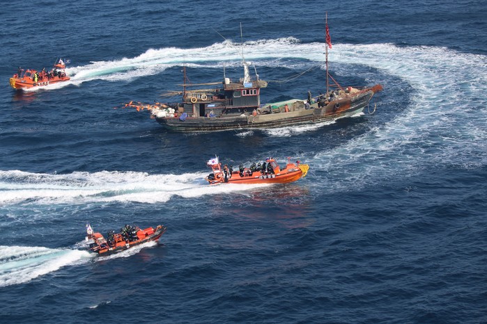 또한 최근에는 밀입국 관련하여 미확인 선박들이 발견됨에 따라 출동함정 통신기기(SSB,VHF)를 이용하여 관할구역 내 항해선박 및 조업선 대상으로 밀입국 예방 해상방송을 실시하고 의심선박에 대해서는 정선명령을 발동하여 검문검색을 강화하고 있습니다.