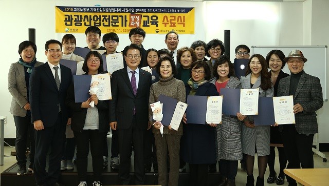 [강진=정찬남 기자] 전남 강진군이 지난 22일 강진읍 시장 내 ICT카페 2층에서 지역산업맞춤형 일자리 창출사업 일환으로 실시한‘관광서비스 전문인력 양성과정 교육’의 수료식을 열었다.