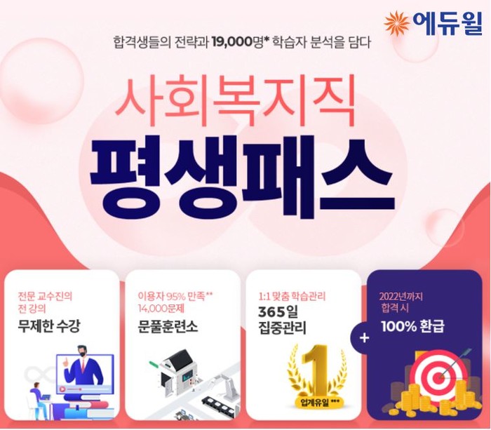 [시민일보 = 여영준 기자] 종합교육기업 에듀윌(대표 박명규)이 사회복지직 9급공무원 시험을 준비하는 수험생을 위해 혜택을 더한 ‘평생패스’ 과정을 선보인다.