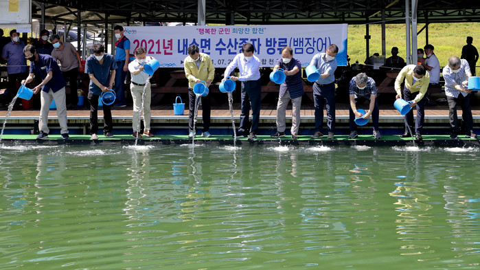 합천군(군수 문준희)은 지난 7월 28일 대병면 합천호 선착장에서 유관기관 및 봉산·대병면 어업계 회원 등 20여 명이 참여한 가운데 뱀장어 치어 약21만 미를 방류했다.