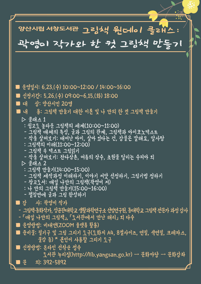 양산시립 서창도서관은 <곽영미 작가와 그림책 만들기> 원데이 클래스를 운영한다.