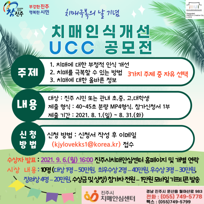진주시는 9월 21일 치매극복의 날을 기념하여 치매 친화적인 사회 문화 조성과 치매 인식 개선을 위해 ‘치매인식개선 UCC 공모전’을 개최한다고 2일 밝혔다.