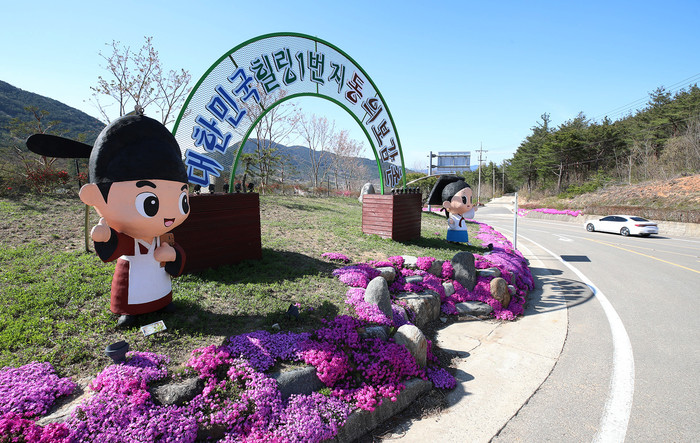 16일 산청 동의보감촌으로 향하는 도로변에 꽃잔디가 만개해 보는 이의 눈을 즐겁게 하고 있다.