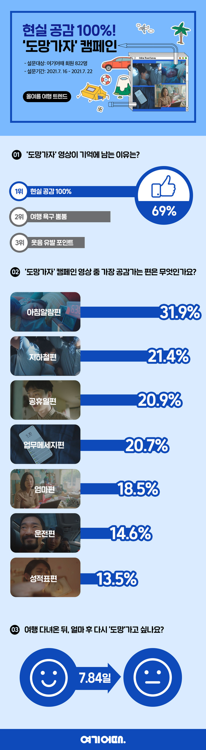 대한민국 대표 종합 숙박ㆍ액티비티 플랫폼 여기어때(대표 정명훈)의 설문조사에 따르면, 응답자의 69%는 최근 브랜드 캠페인 '도망가자'가 담고 있는 상황이 "공감 된다"고 응답했다.