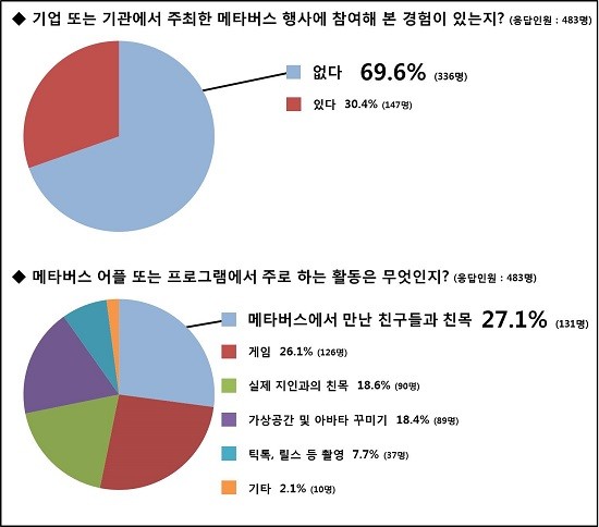 메타버스를 이용해 본 경험이 있는 483명의 학생들을 대상으로 한 ‘기업 또는 기관에서 주최한 메타버스 행사에 참여해 본 경험이 있는지’에 대한 질문에는 ▲없다(69.6%, 336명), ▲있다(30.4%, 147명)라고 응답했다.